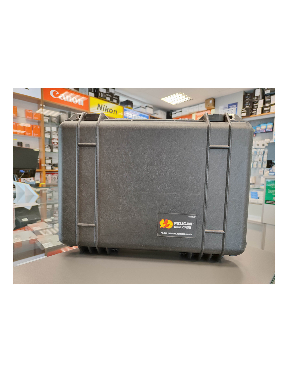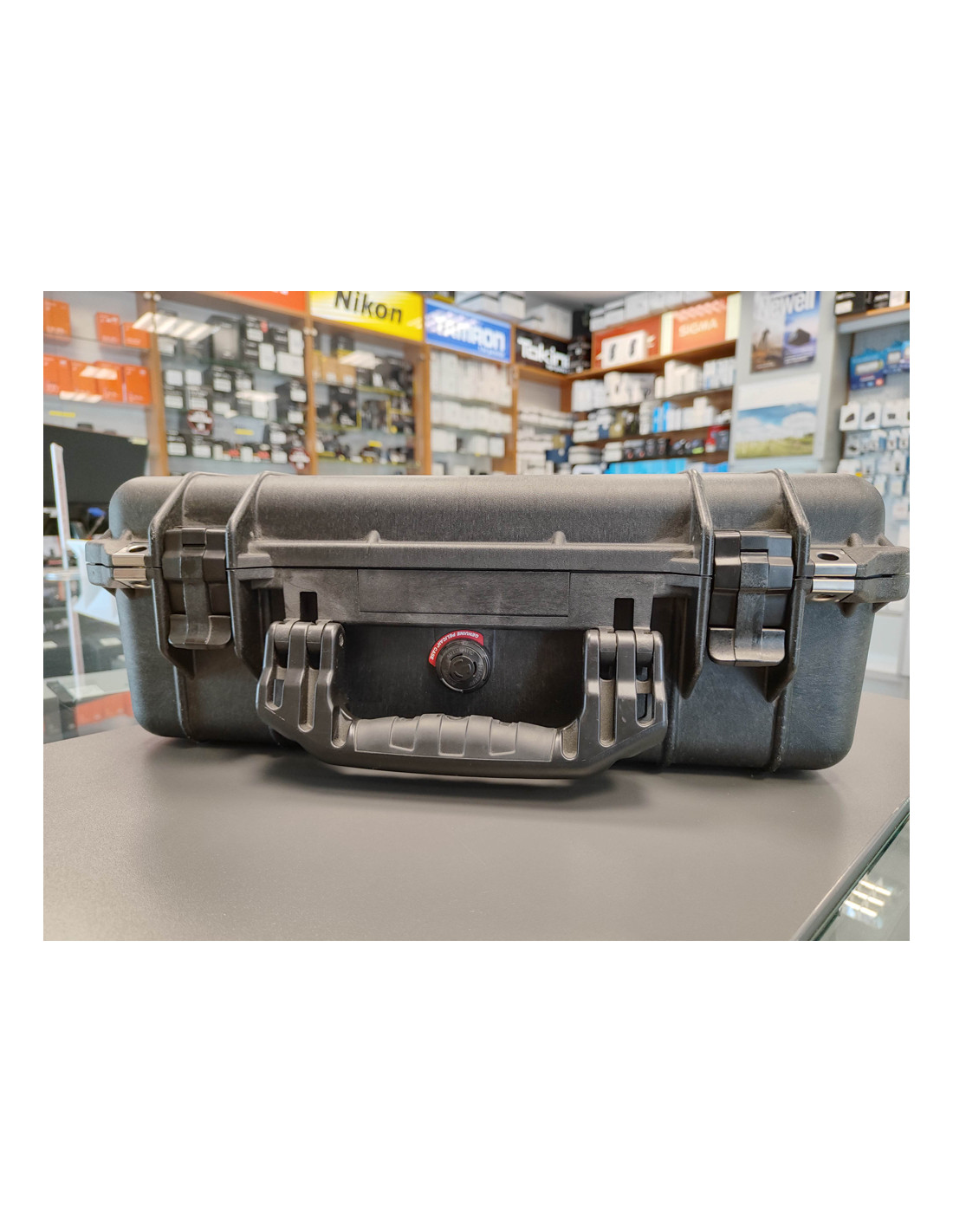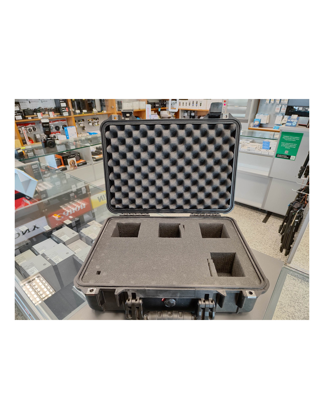 Lepo ohranjen Pelican kovček (hard case) z oblazinjeno notranjostjo, ki so jo lahko poleg že obstoječih mest za 4 objektive dodatno prilagodi po lastni potrebi.