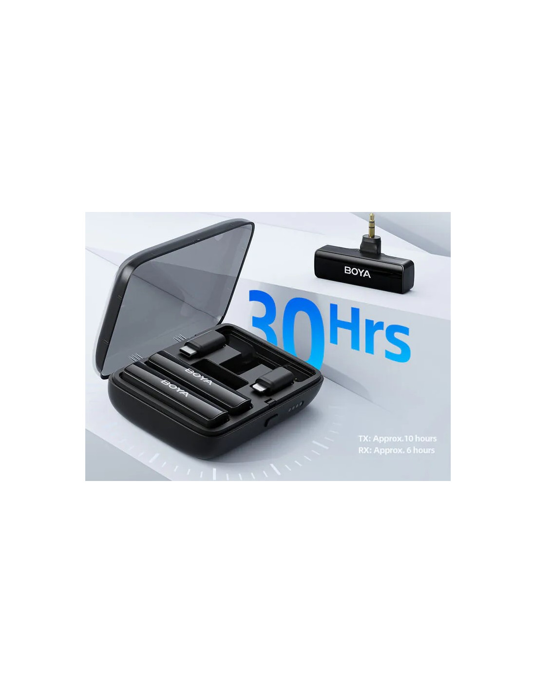 Oddajnika imata tudi funkcijo utišanja (mute) in močnega učinka odpravljanja šumov (noise reduction). Sprejemnik deluje po zasnovi plug and play, kar pomeni, da se samodejno povežeta z vašim pametnim telefonom ali fotoaparatom za najlažje možno upravljanje. Življenjska doba baterije: Oddajnik Boyalink deluje do 10 ur, medtem ko se sprejemnik zdrži do 6 ur. Polnilna škatlica pa omogoča napajanje do 30 ur.