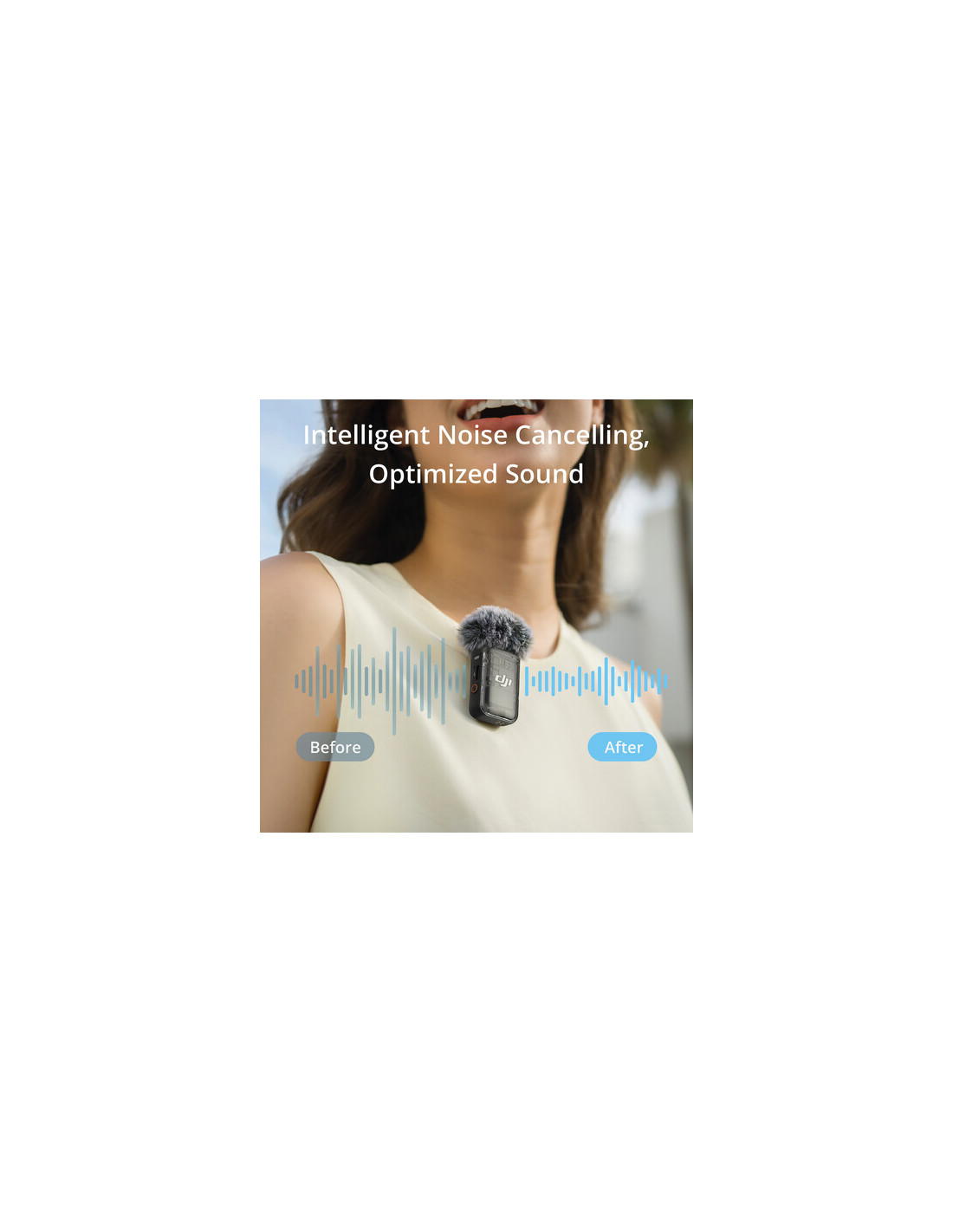 DJINovi dvokanalni DJI MIC 2 brezžični mikrofonski sistem za snemanje zvočnih virov na pametni telefon, prenosni računalnik, tablico, fotoaparat ali kamero. Oddajnik in sprejemnik imata izjemen 6 urni čas delovanja. Oddajnika imata 8GB notranjega spomina, kar zagotavlja približno 14 ur snemanja (32-bit Float Internal Recording). Mic2 podpira USB-C, Lightning ter analogne 3,5mm TRS izhode. Združljiv je z večino fotoaparatov, pametnih telefonov in računalnikov.