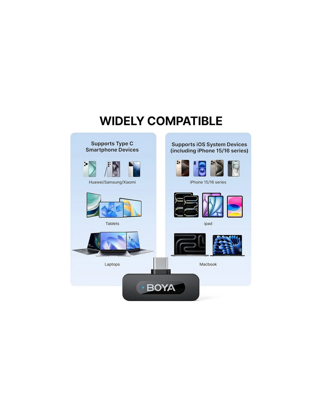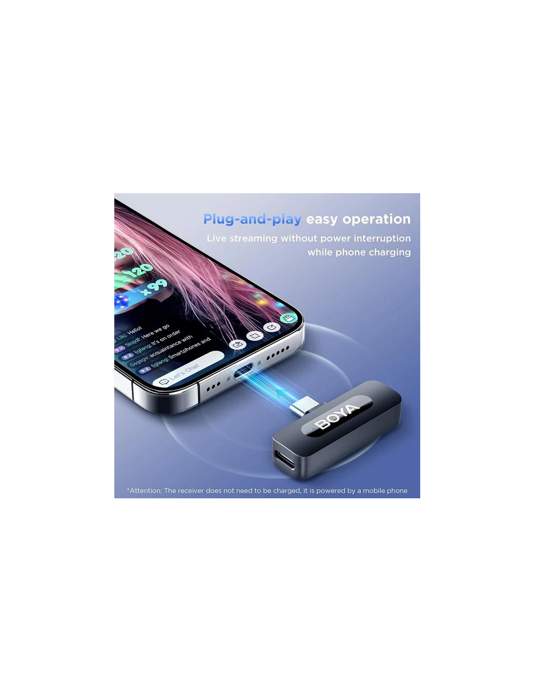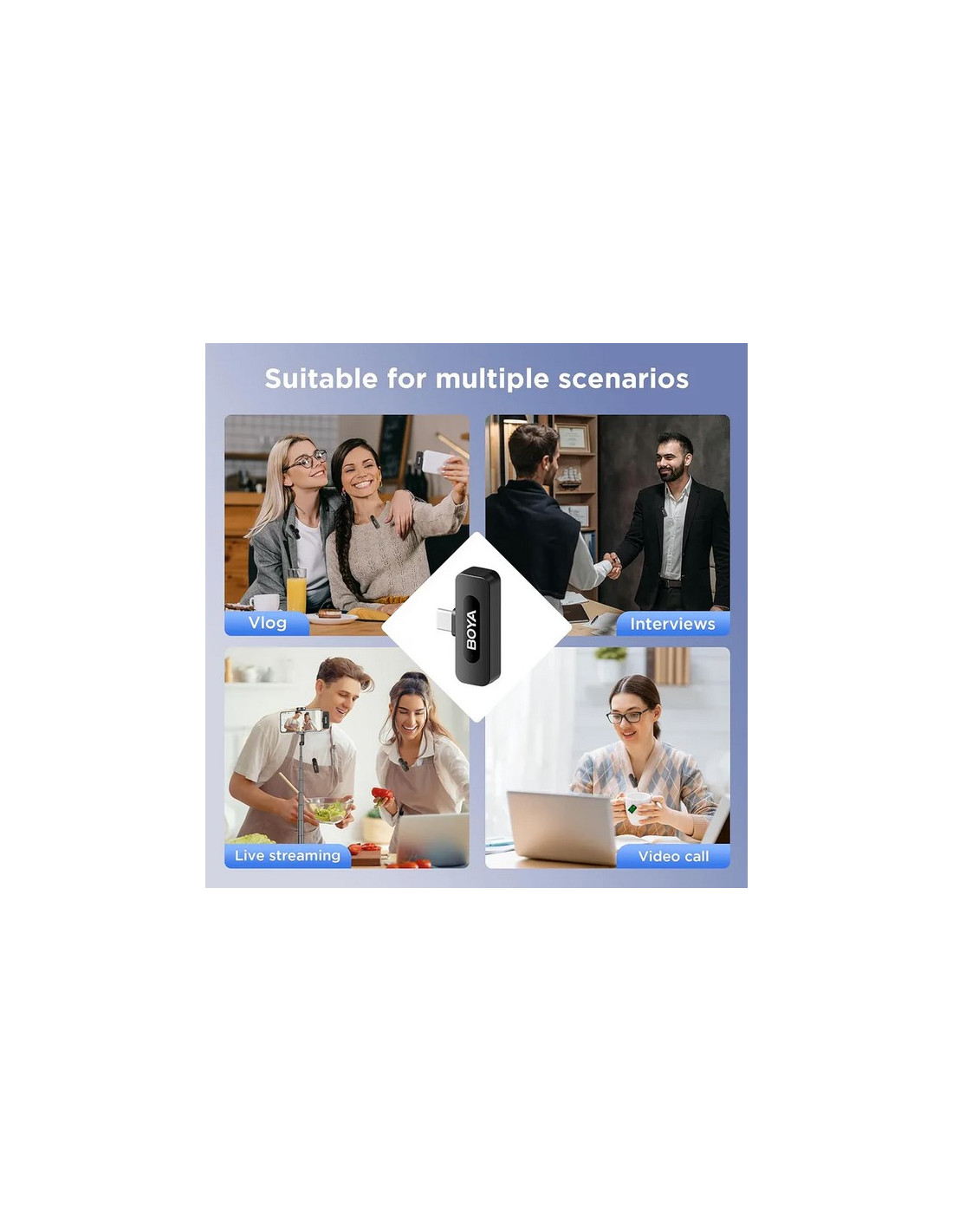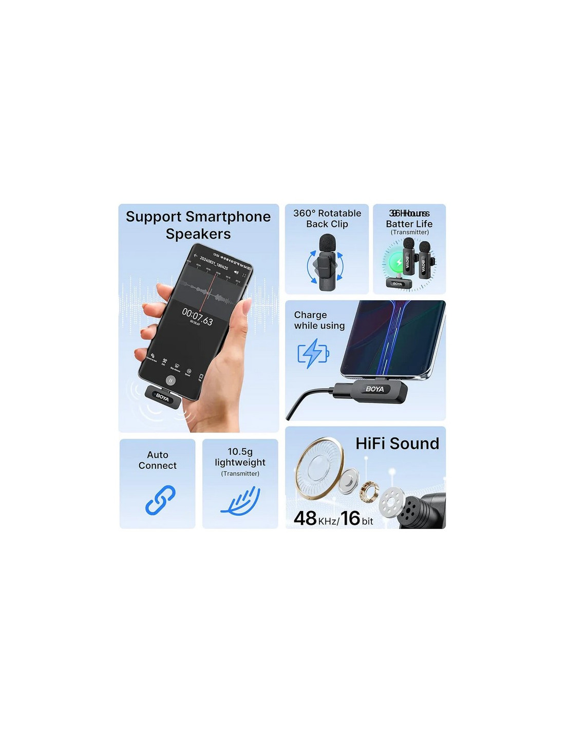 Boya BY-V10 V2.0 je vsestranski in kompakten mikrofon, kot nalašč za zajemanje profesionalnega zvoka na poti. S svojo povezavo USB-C zagotavlja brezhibno združljivost s pametnimi telefoni in tabličnimi računalniki Android (tudi novejšimi Apple napravami z USB-C vhodom), zaradi česar je idealen za video dnevnike, intervjuje, pretakanje v živo in drugo. Zaradi lahke zasnove in vrhunske kakovosti zvoka je odlična izbira za ustvarjalce vsebin in profesionalce. Mikrofon tehta le 14 gramov, zaradi česar je izjemno lahek in s 5 cm dolžine zelo prenosljiv. Vsebuje inteligentno tehnologijo za odpravljanje šumov, ki zagotavlja jasen in oster zvok tudi v vetrovnih razmerah. S samodejnim združevanjem in funkcijo plug-and-play je kot nalašč za vsakodnevno ustvarjanje vsebine, intervjuje z novicami in spletna srečanja.