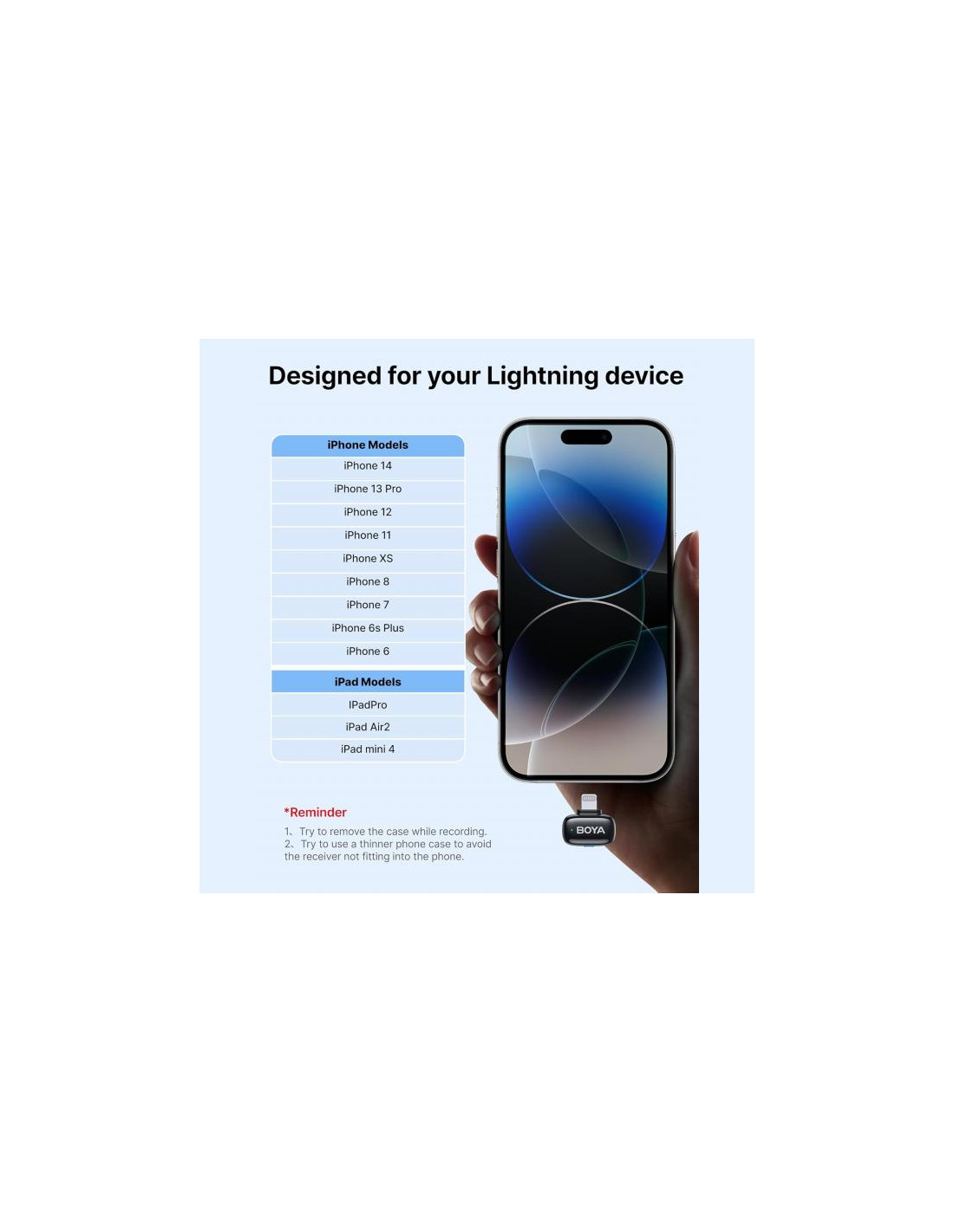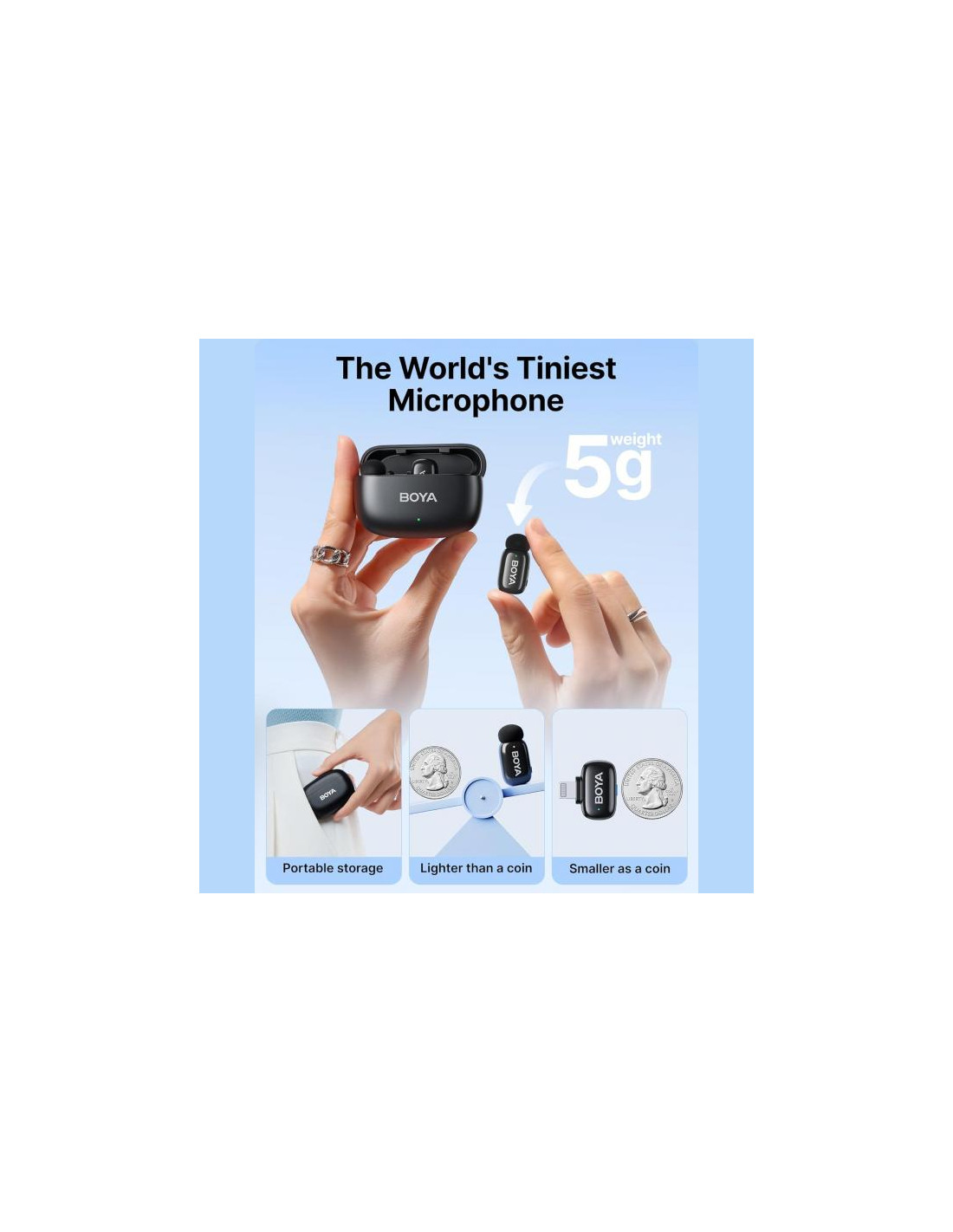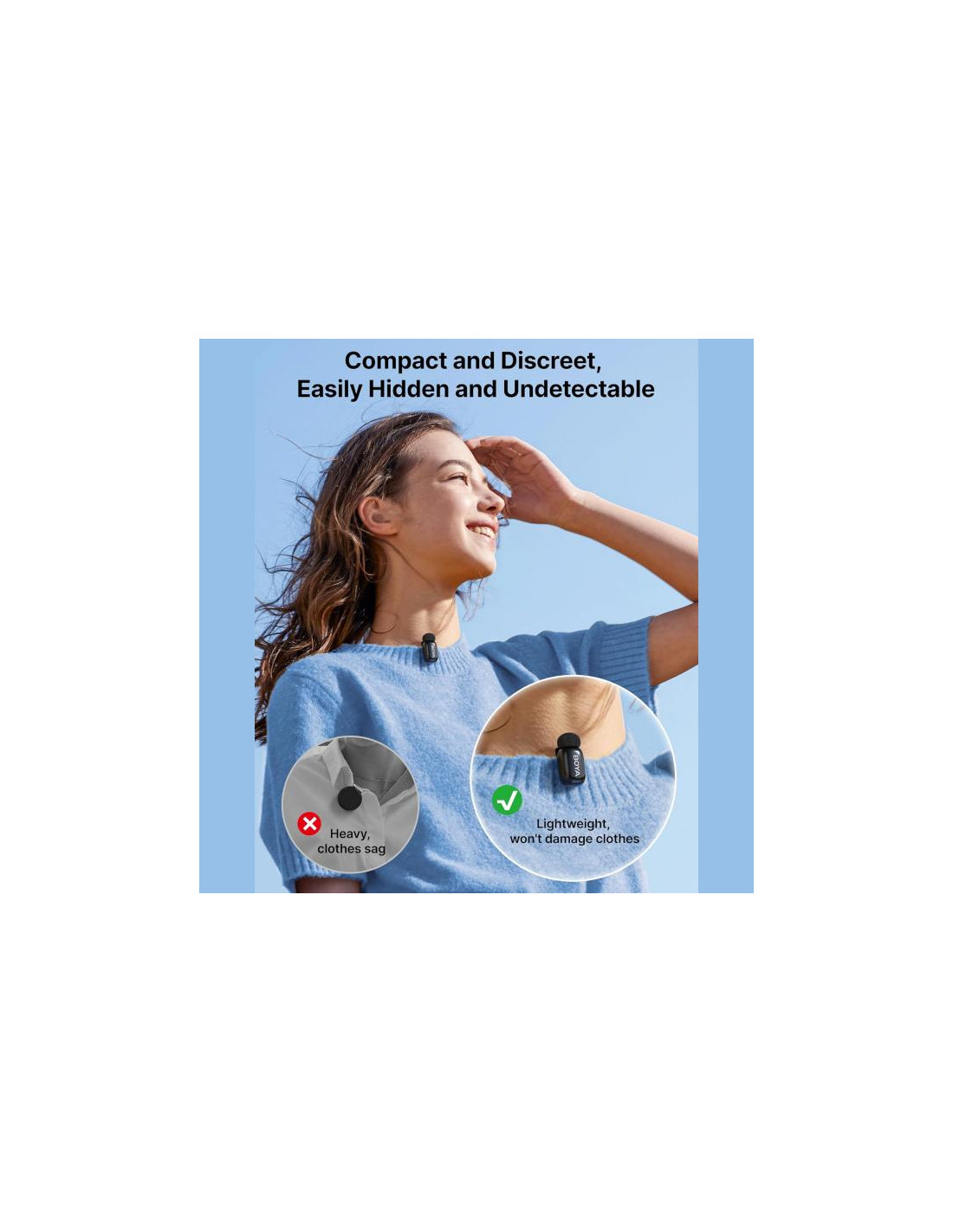 Brezžični mikrofonski sistem mini 2 za dve osebi z enim sprejemnikom Lightning je eleganten, lahek in diskreten brezžični mikrofonski sistem. S frekvenčnim odzivom od 20 Hz do 20 kHz natančno in jasno absorbira vsako podrobnost, hkrati pa uporablja tehnologijo umetne inteligence za odpravljanje neželenih zvokov, kot so veter, statična elektrika, poki in drugo. Nizkofrekvenčni filter samodejno odstrani neželene nizke frekvence, priložena penasta zaščita pred vetrom pa zagotavlja tudi profesionalno izolacijo in zmanjšanje šuma. Vzorčenje 48 kHz in 24-bitni zvok zagotavljata, da je zvok vedno brezhiben in studijske kakovosti. Za maksimalno brezskrbnost uporabnika aplikacija Boya vključuje več varnostnih funkcij, kot je varnostna sled, ki posname "varnostno kopijo" vaše sledi pri -12 dB, da prepreči obrezan in preobremenjen zvok pri glasovnih in lokacijskih posnetkih.