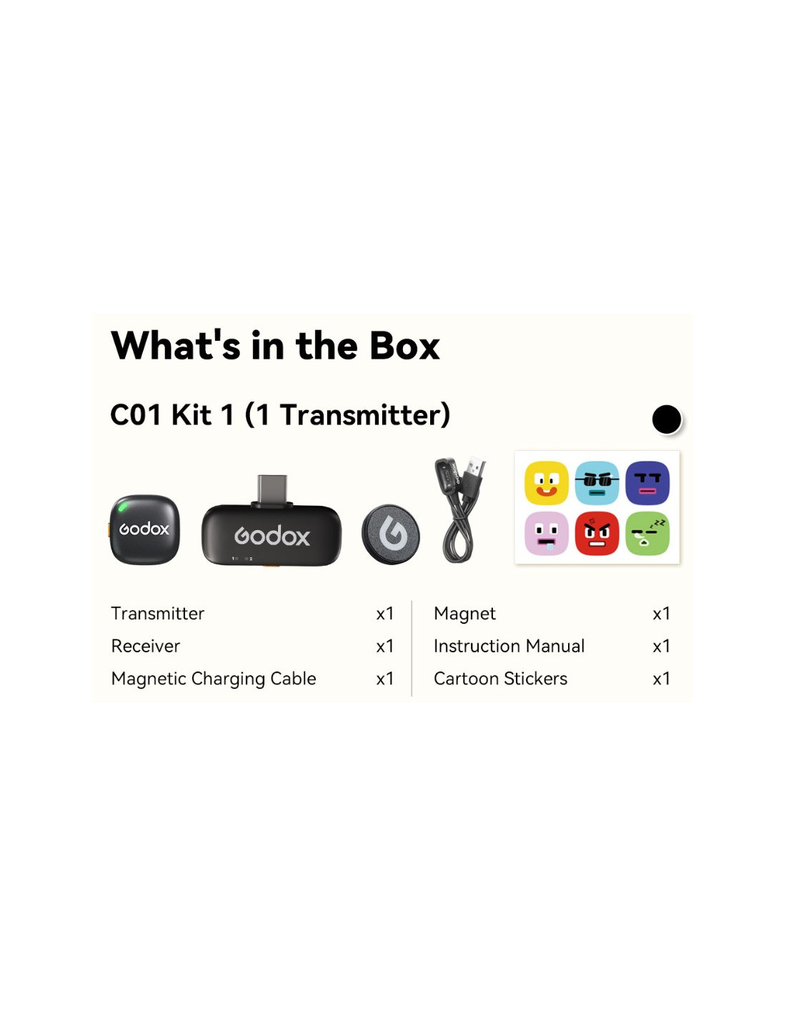 Brezžični mikrofonski sistem C01 omogoča snemanje posameznih vlogov ali intervjujev z mobilno napravo zahvaljujoč sprejemniku z USB-C priključkom. Preprosto pritrdite oddajnik na oblačila sogovornika s pomočjo magnetne sponke in priključite sprejemnik neposredno na napravo USB-C, da takoj ustvarite izboljšane zvočne posnetke za družbena omrežja. Sprejemnik in oddajnik lahko komunicirata na razdalji do 200 metrov s frekvenco 2,4 GHz.