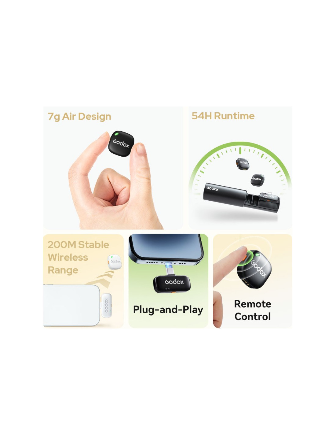 Algoritmi za zmanjševanje šuma DSP in AI pomagajo ločiti glasove od hrupa v ozadju in tako izboljšati kakovost govora. Vgrajen samodejni nadzor glasnosti prilagaja glasnost v realnem času, da kompenzira nepričakovan hrup v nepredvidljivih okoljih. Oddajnik vam omogoča tudi daljinsko sprožitev snemanja s pametnim telefonom, povezanim s sprejemnikom, s pritiskom na integriran gumb za začetek/ustavitev snemanja. Vgrajena baterija s kapaciteto 97 mAh v oddajniku zagotavlja 9 ur delovanja, medtem ko sprejemnik napaja priključena naprava. Vrata USB-C na sprejemniku podpirajo hitro polnjenje pametnega telefona z močjo 60 W za celodnevno snemanje.
