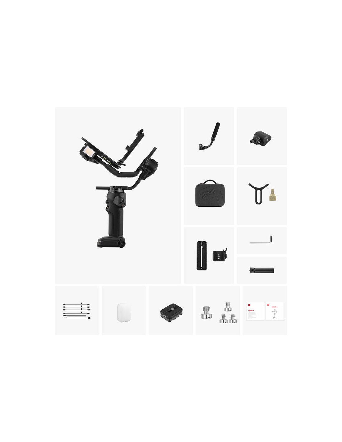 - V kompletu: stabilizator Crane 4, Mini Tripod, Lower Quick Release Plate, Upper Quick Release Plate, Camera Quick Release Plate, Lens Support, Sling Grip, Wrist Rest, USB-C to Sony Multi Control Cable, USB-C to Mini-USB Canon Control Cable, USB-C to Micro-USB Canon Control Cable, USB-C to USB-C Panasonic Control Cable, USB-C Charging Cable, Fill Light Diffuser, 3 x 1/4"-20 Screw, 3/8"-16 Screw, Allen Key, Carrying Case